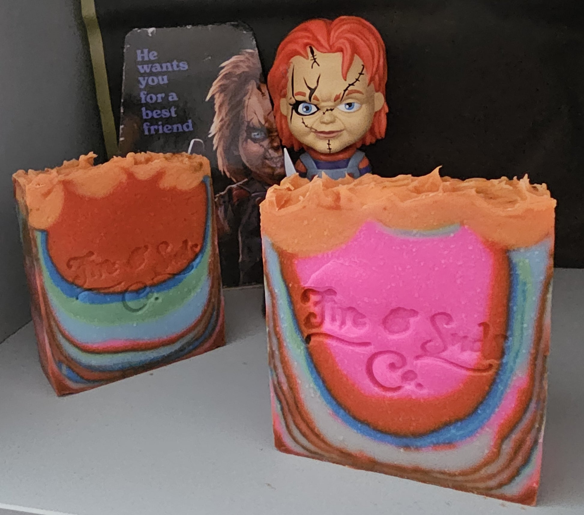 The soap features a vibrant, multi-color swirl reminiscent of Chucky's iconic outfit. It's a perfect blend of fun and fright, appealing to horror fans and soap enthusiasts alike!